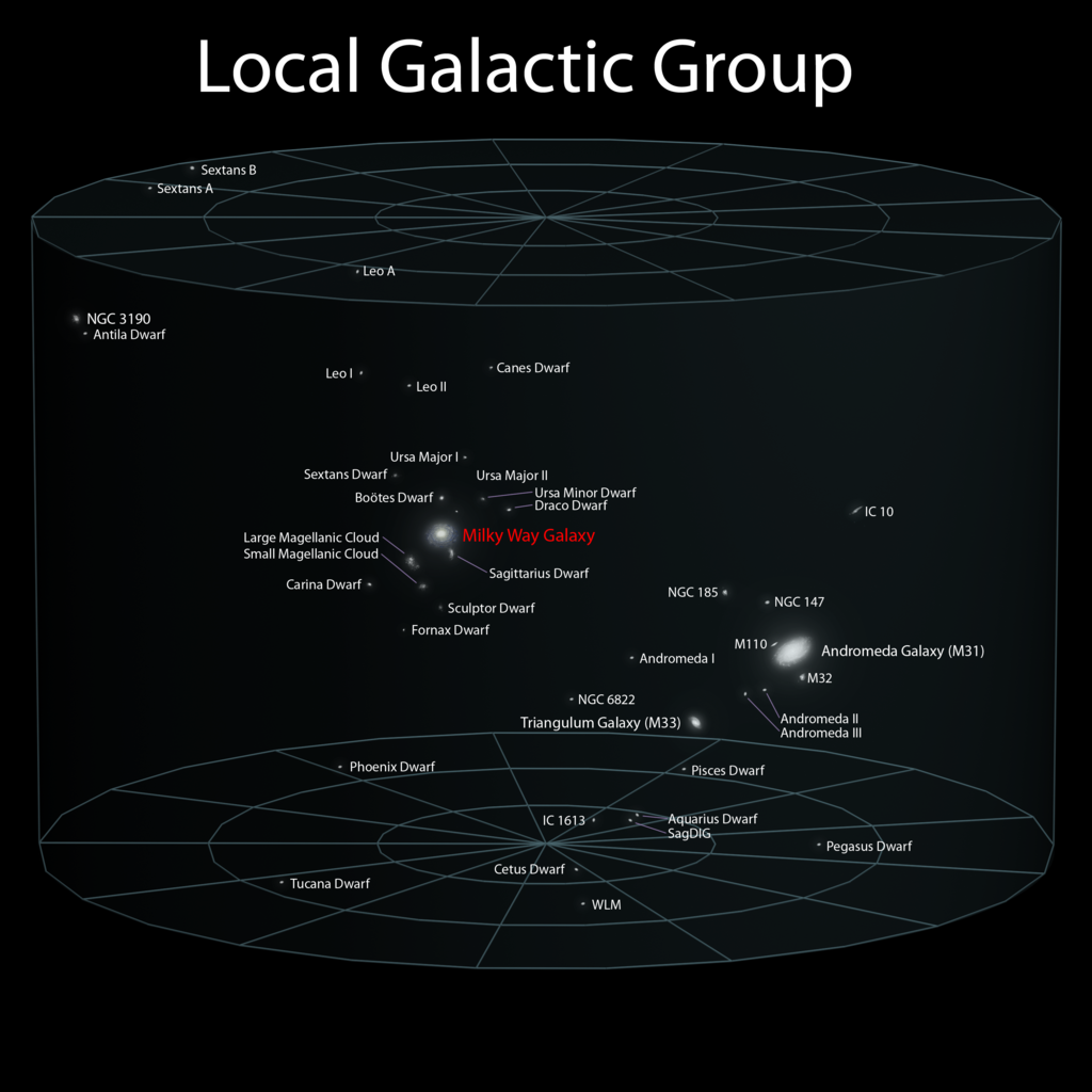 The Local Group is spread across a circle ten million light-years across and centered between the Milky Way and Andromeda. Cosmic background radiation studies show that the Local Group is travelling at a speed of roughly 36,000 kilometres (22,000 miles) per hour in the direction of the constellation Hydra.