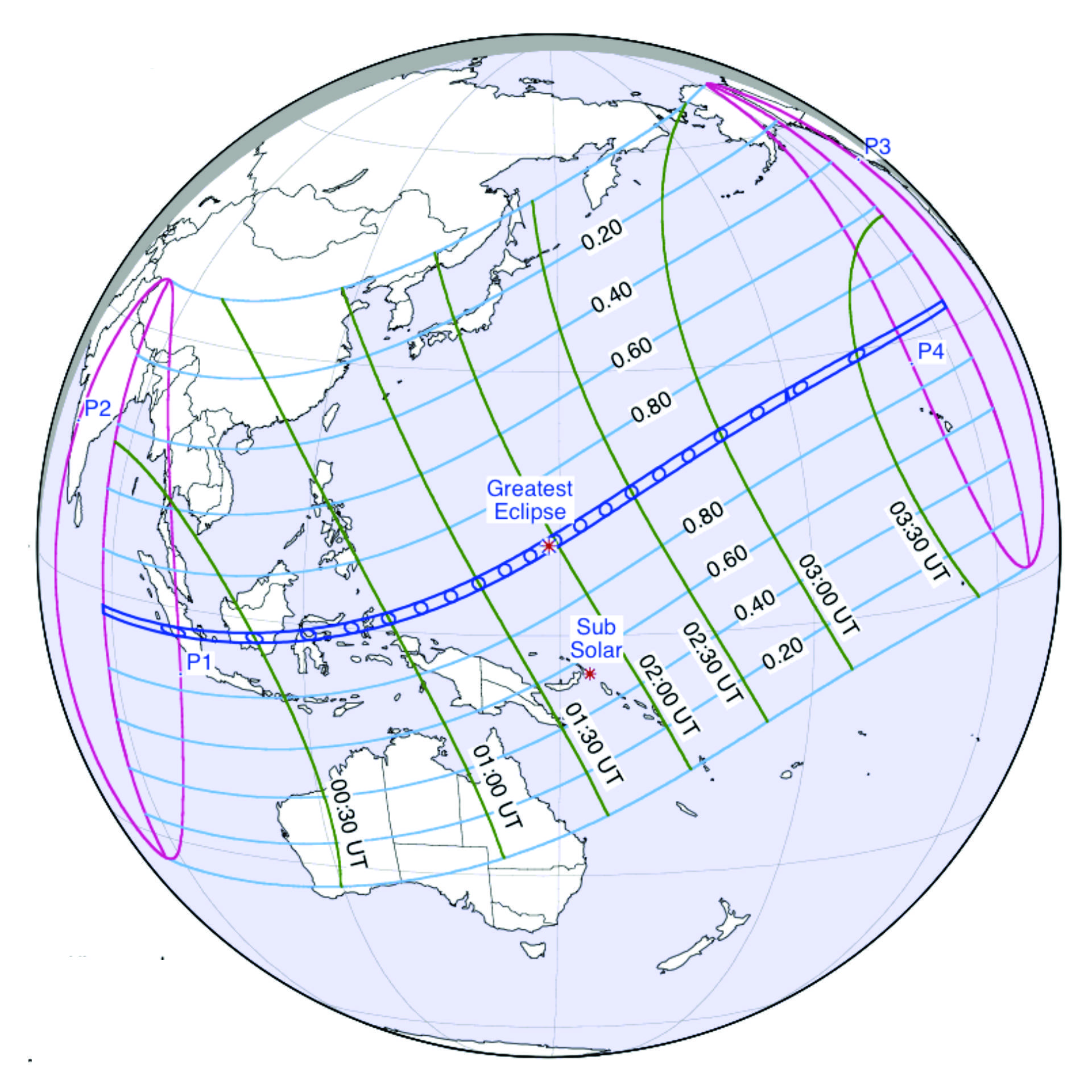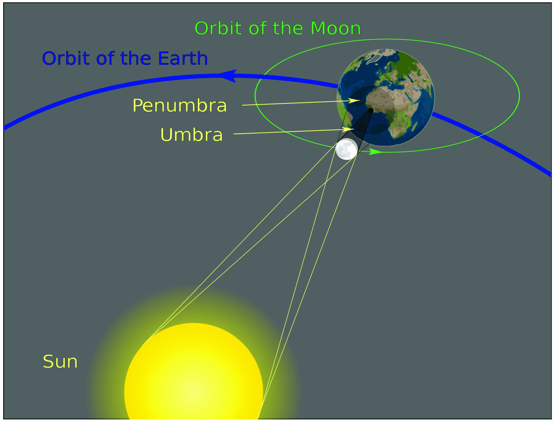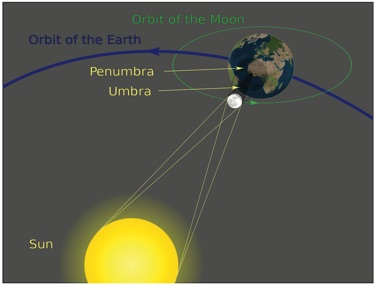 The dark, inner part of the shadow cast by the Moon on the Earth is known as the umbra. A person standing within the umbra will experience a total solar eclipse. The path of the umbra will slowly track eastward as the Earth rotates. This dark path that the umbra sweeps out as it travels over the surface of the Earth is known as the path of totality. Everyone standing within the path of totality will experience a total solar eclipse, a complete blocking of the Sun’s disk by the Moon. The outer part of the Moon’s shadow, where only some of the Sun’s light is blocked is known as the penumbra. Observers on the Earth in the penumbra shadow will see a partial solar eclipse.