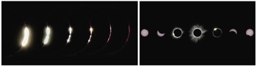 The Moon will cast a dark shadow on the Earth when it passes directly between the Sun and the Earth. This blocking of the Sun’s light produces a phenomenon known as a solar eclipse. The view to the right in the main panel shows a total solar eclipse as seen from Sampit, Indonesia on March 9, 2016. During a total solar eclipse the Moon completely covers the Sun’s disk. The March 9, 2016 solar eclipse was the most recent total solar eclipse.