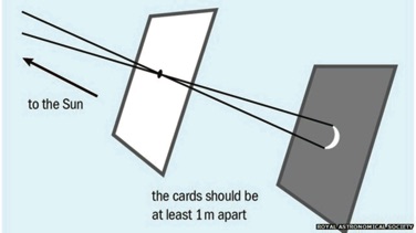 One of the safest ways to observe a solar eclipse is through the method of pinhole projection. This method projects an image of the Sun thorough a pinhole on an upper card to a second viewing card behind the first pinhole card. Make sure that your back is to Sun when viewing the projected image on the second card; this reduces any chance that you may inadvertently look at the Sun during this process of pinhole projection. What you have really produced with these two cards is a very simple pinhole camera.