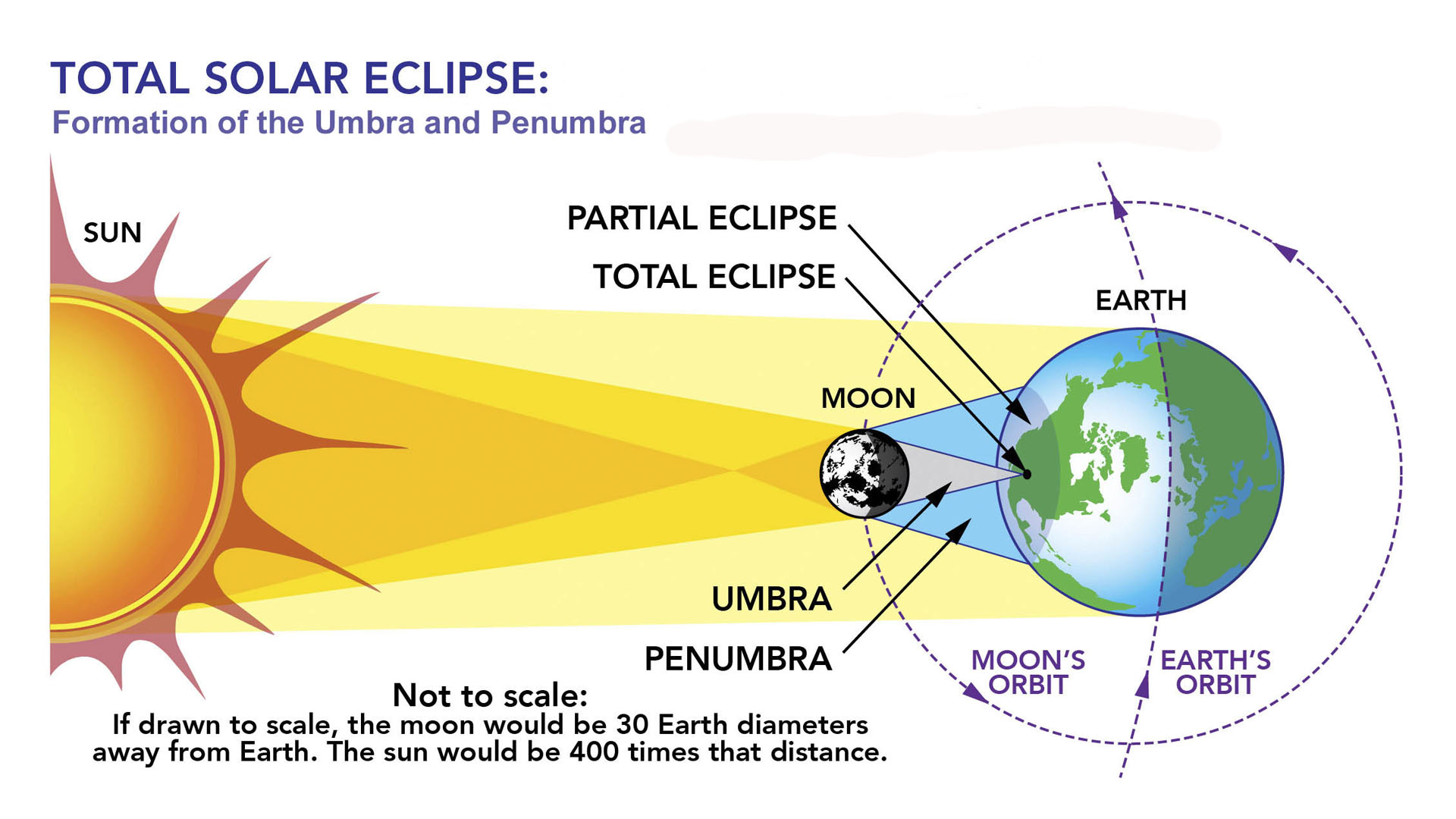 The dark, inner part of the shadow cast by the Moon on the Earth is known as the umbra. A person standing within the umbra will experience a total solar eclipse. The path of the umbra will slowly track eastward as the Earth rotates. This dark path that the umbra sweeps out as it travels over the surface of the Earth is known as the path of totality. Everyone standing within the path of totality will experience a total solar eclipse, a complete blocking of the Sun’s disk by the Moon. The outer part of the Moon’s shadow, where only some of the Sun’s light is blocked is known as the penumbra. Observers on the Earth in the penumbra shadow will see a partial solar eclipse.