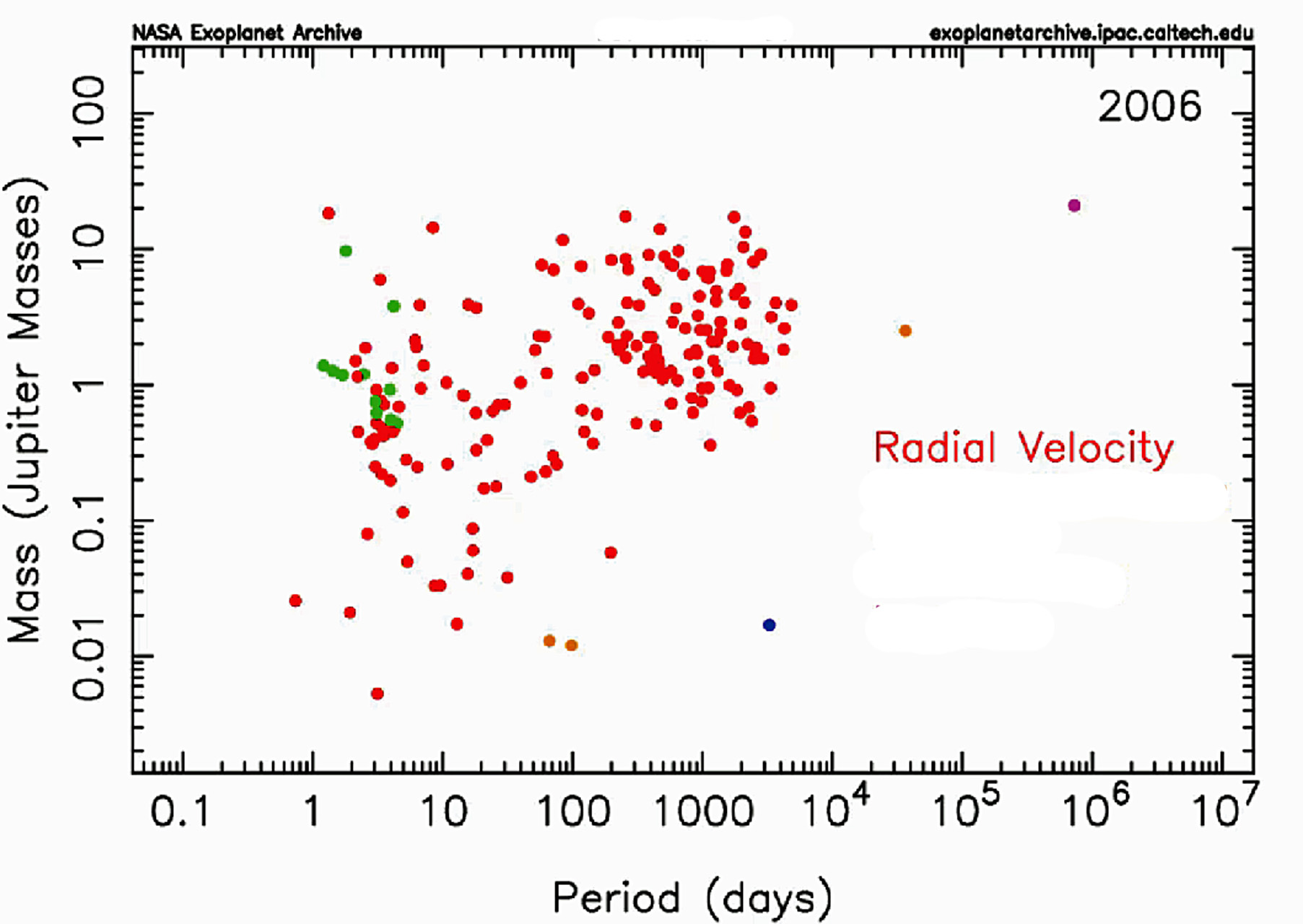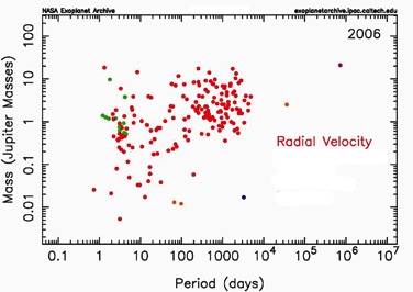 The method that lead to the initial detection of a substantial number of exoplanets is known as the radial velocity method. This method depends on the slight wobbling of a star as a large exoplanet circles around it. For example, examine the star known as HIP27887 in the main view panel. Assume that this star has an exoplanet circling it (labeled HIP27887 b). If this exoplanet initially lies between the observer (i.e. you) and its star, then the gravitational attraction from the exoplanet would pull the star slightly in your direction. This would result in the light from the star being slightly blue shifted as a result of a Doppler shift in the light. When the exoplanet is on the far side of its star, the exoplanet’s gravitational attraction would then pull the star slightly away from you. You would then observe this as a slight red shift in the star’s emitted light. The motion of the exoplanet around its star would thus result in a regular pattern of emitted light from the parent star changing from a blue shift to a red shift, and then back again to a blue shift. It is this periodic shifting of light between blue and red from a particular star that alerts scientists to the presence of a possible exoplanet. The exoplanet is not directly observed, but its presence is inferred from the periodic light pattern of its host star.