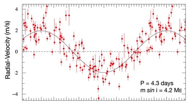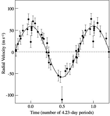 In 1995, an exoplanet was discovered orbiting the star 51 Pegasi. This exoplanet, named 51 Pegasi b, was discovered using the radial velocity method. The discovery of 51 Pegasi b is important because it was the first exoplanet found to be orbiting a main-sequence star. Indeed, 51 Pegasi is a star that actually bears many similarities to our own Sun. 51 Pegasi is a G2V class spectral type star (as is the Sun), it has a mass 1.06 times that of our Sun, and a radius that is 1.2 times that of the Sun. The exoplanet 51 Pegasi b, however, is quite unlike Earth in its physical properties. It has an orbital period of 4.23 Earth days, a mass that is approximately 150 times that of Earth, and a surface temperature of approximately 5,000° C (9,000° F).