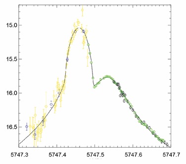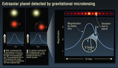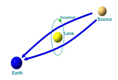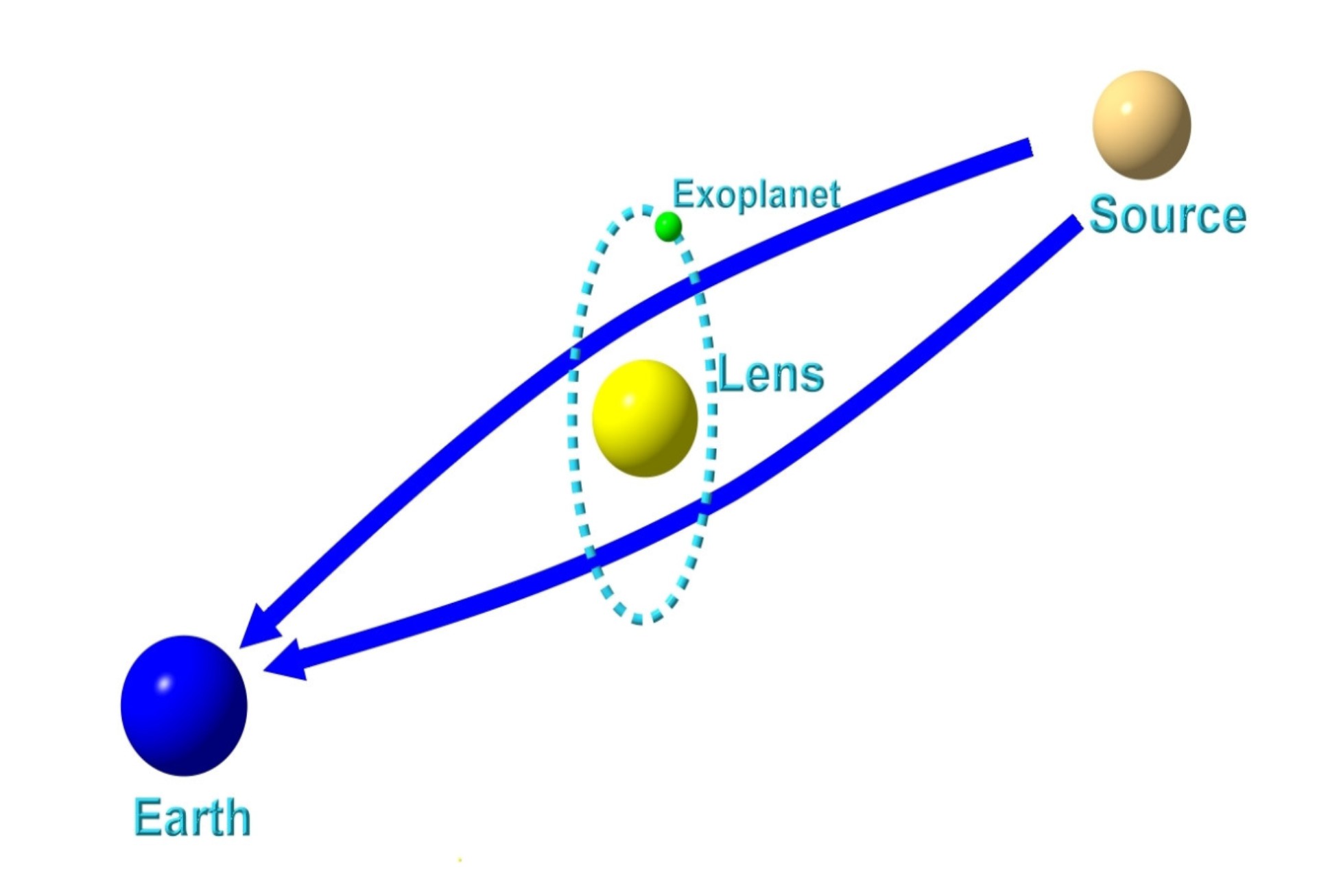 Another indirect method for detecting exoplanets is known as gravitational microlensing. This method depends on the observer and two distant stars being in close alignment with one another. Light from the background star is bent by the curvature of space around the foreground star. This results in the foreground star acting as a sort of magnifying glass for the distant star. The foreground star is typically called the lens star in such an arrangement. An exoplanet orbiting a lens star can also act as a small gravitational lens. The effect of the small second gravitational lens from the exoplanet produces a small spike in the light from the original star. It is the presence of this small spike that alerts astronomers to the presence of an exoplanet.