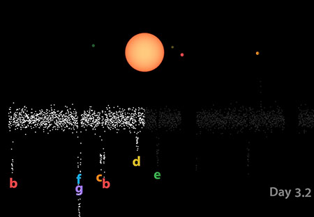 Transit methods only work for the small percentage of star systems that are oriented edge-on towards Earth. Fortunately, that’s still a lot of stars! On a regular interval each planet transits the disk of its star, temporarily causing a slight reduction of the star’s light (on the order of 1 part in 10,000) as viewed from Earth. The amount of the reduction is proportional to the size of the planet. The dip re-occurs every time the planet completes an orbit. By recording the brightness of the starlight continuously over a long period of time, we can determine the length of a planet’s year and the radius of its orbit.