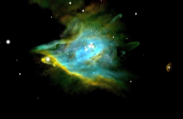 What we call the Orion Nebula is really just the central part of a larger cloud that stretches across several hundred light-years. Four bright stars in a parallogram near the nebula's center form the Trapezium. These hot young stars heat up the surrounding gas clouds. Like a free-form fluorescent light bulb or neon light, the gas clouds light up in response to energy from these stars. The Orion Nebula is full of hot, bright blue stars and is an area of active star formation.