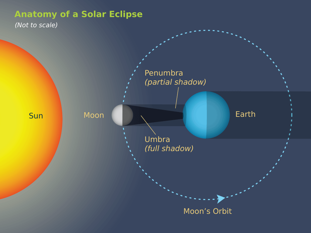 A total solar eclipse happens when Earth, the moon, and the sun are in exact alignment and the moon casts a shadow on the Earth's surface. The three bodies are in the right order every month, with each new moon, but most often the moon passes "above" or "below" the sun (as seen from Earth) and no shadow hits the planet's surface. The moon's orbit is tilted about five degrees relative to the plane of Earth's orbit around the sun; only when all three bodies are in the right order and in the same plane is there an eclipse.