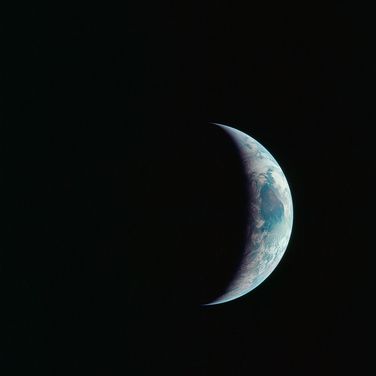As Apollo 11 approached the end of their flight, they had this view of a crescent Earth. Visible was the Horn of Africa and the Indian Ocean.