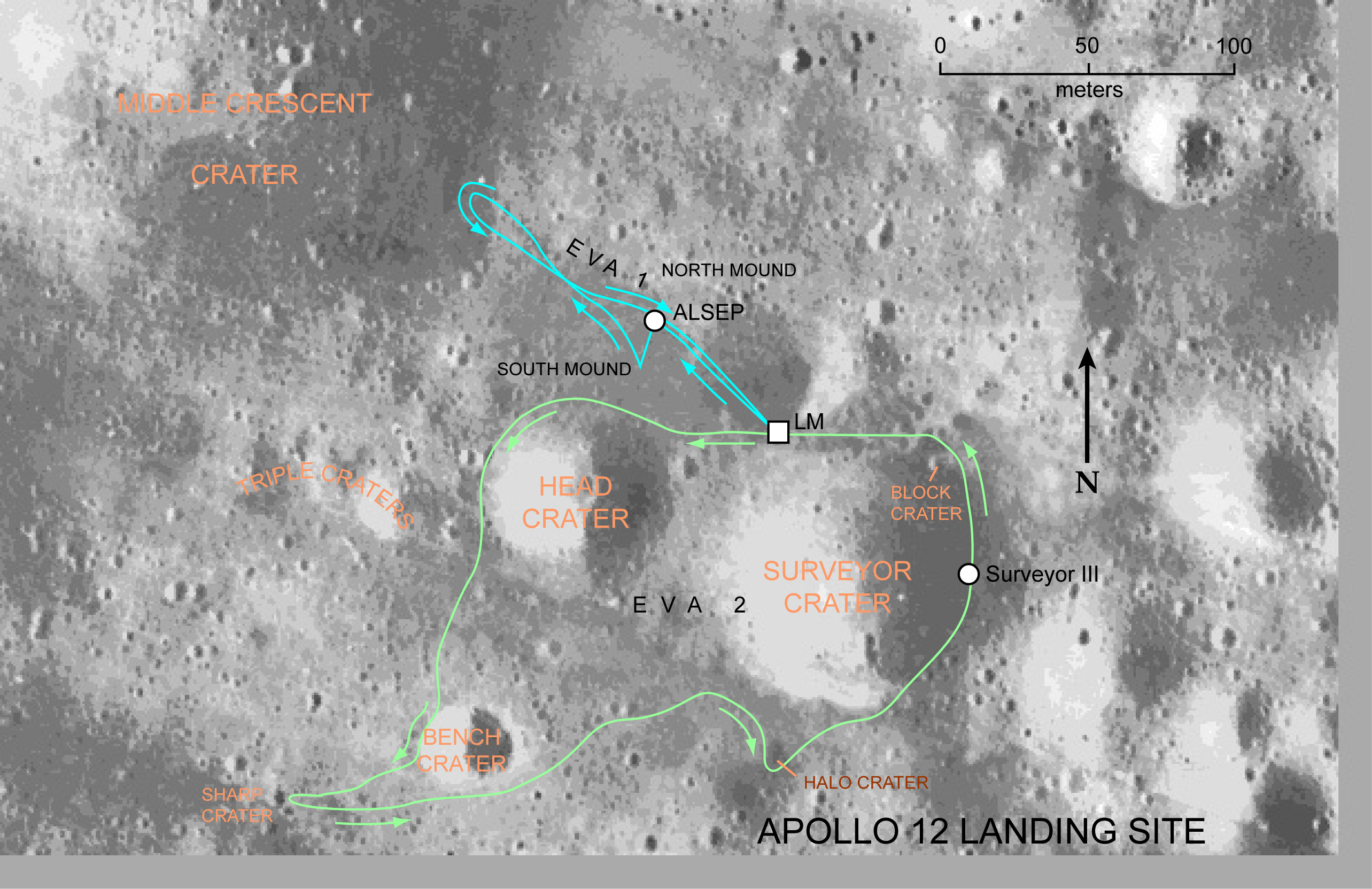 The Apollo 12 astronauts performed two moonwalks on their flight. During the first moonwalk they set up the ALSEP experiment package and collected lunar samples. They walked about 1 km during this four hour period outside the lunar module.