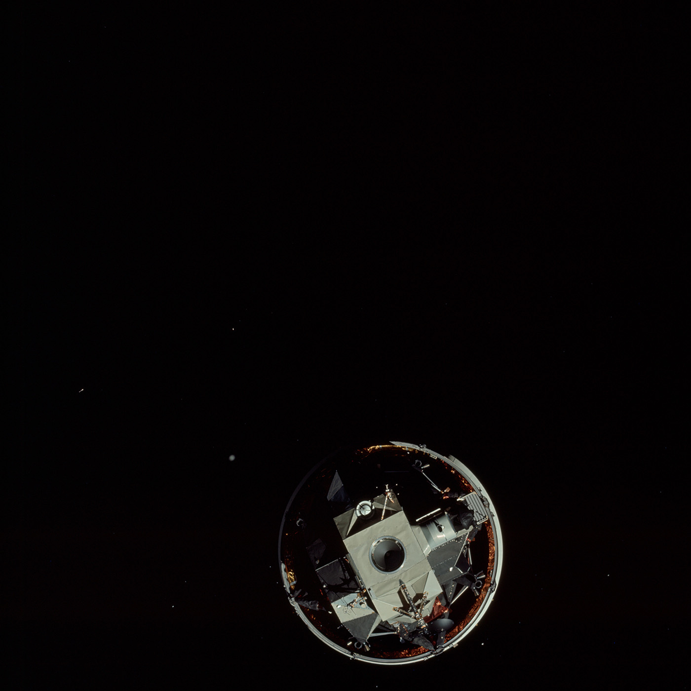 Three hours into the mission, the crew separated the Command Serivce Module (nicknamed Odyssey) from the third stage and docked with the Lunar Module (nicknamed Aquarius). After the Lunar Module was extracted from the third stage, Mission Control changed the third stage’s trajectory so that it would impact on the lunar surface. Previous third stages had been sent past the moon into solar orbit. The energy of the impact was detected by seismic instruments left by the Apollo 12 astronauts. Future Saturn V third stages were successfully impacted on the moon.