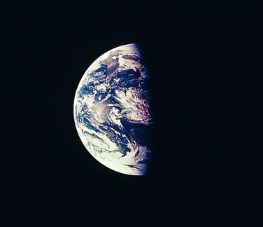 This is an Apollo 8 hand-held Hasselblad photograph of a half illuminated Earth taken on December 24, 1968 as the spacecraft returned from the first manned orbit of the moon. The evening terminator crosses Australia, toward the bottom. India can be seen at upper left. The sun is reflecting off the Indian Ocean. The Earth is 12,740 km (7,900 miles) in diameter, north is at about 1:00.
