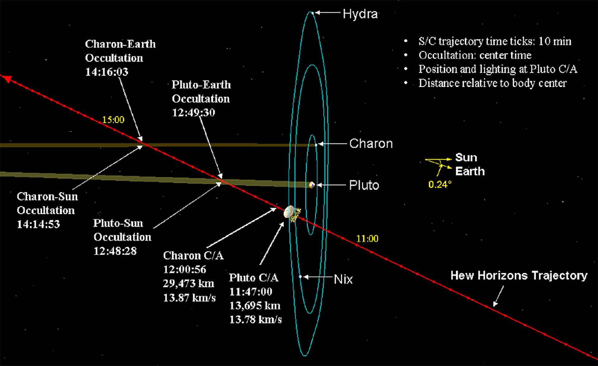 On July 14, 2015 (Pluto Day), the New Horizons spacecraft will experience its closest approach to both Pluto and its moon Charon. The spacecraft is expected to approach to within 12,500 km (7,750 miles) of Pluto and within 28,800 km (17,900 miles) of Charon. High-resolution pictures of surface features as small as 60 m (200 feet) on Pluto will be possible during the time of closest approach.